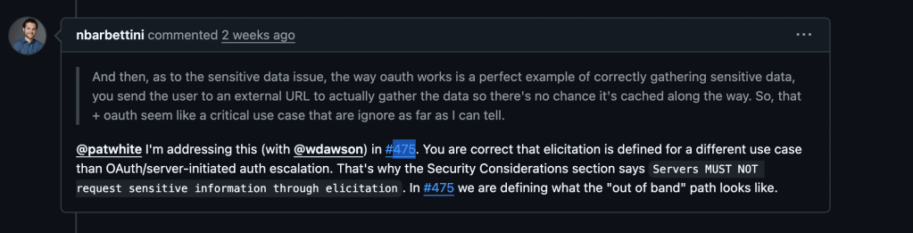 - Not for Authentication: Elicitation is not a way for servers to ask for your login credentials. Authentication is handled securely and separately by trusted Identity Providers (IdPs). For scenarios requiring authentication or increased permissions, elicitation might trigger a redirect to a secure browser-based flow (as detailed in the upcoming GitHub Pull Request #475), ensuring sensitive login data never directly passes through the MCP channel.
